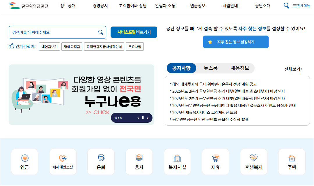 공무원연금관리공단 홈페이지는 대한민국 공무원을 위한 연금, 복지, 재정 서비스 등을 한 곳에서 제공하는 포털입니다. 공무원, 특히 퇴직 후 안정적인 재정관리를 원하는 분들이 필요한 정보를 손쉽게 확인하고 활용할 수 있는 사이트로, 연금 정보뿐 아니라 각종 복지 혜택과 최신 공단 소식을 손쉽게 접할 수 있습니다.