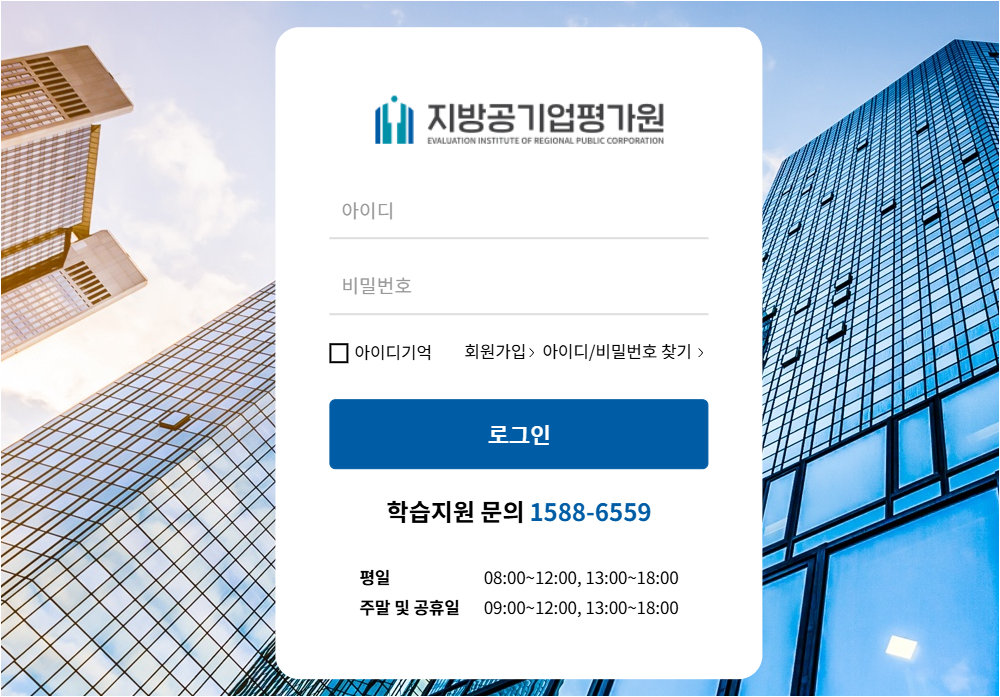 학습지원 문의 1588-6559 평일 08:00~12:00, 13:00~18:00 주말 및 공휴일 09:00~12:00, 13:00~18:00 Copyright © 지방공기업평가원. All Right Reserved. [개인정보처리방침]
